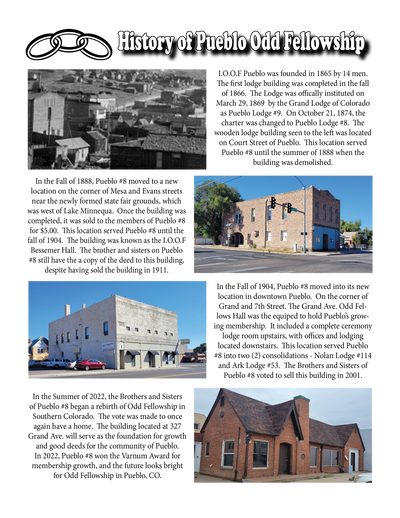 The first accounts of Odd Fellows in Pueblo are in 1865. There were 5 men from the Kansas area that had come together in Pueblo to form their unofficial Odd Fellows Lodge. In 1869, the Grand Lodge of Colorado was formed, and three Odd Fellow lodges were granted charters in Pueblo. The Star Lodge, The Ark Lodge, and The Pueblo Lodge. The Pueblo Lodge was originally given the name of Pueblo #9, but several months after the original charter, it was changed to Pueblo #8.